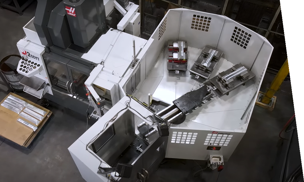The Haas VMC Pallet Pool increases spindle run time, and allows for unattended automation, so you can run more parts at the end of the day. Providing 4 total pallets (1 machining location and 3 storage locations), this pallet pool is a must-have for shops looking to boost throughput using small-footprint Haas VF-2YT series machines.